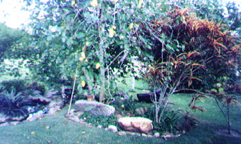 Foto 80 - Recantos: construção de recantos entre lagos, tendo como banco pedras em granito cinza e mármore branco em estado bruto, rodeados por seixos rolados por pés de amoras e figos confrontando sua coloração. |